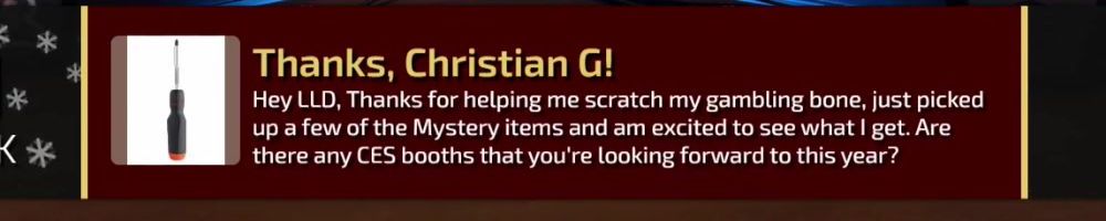 Hey LLD, Thanks for helping me scratch my gambling bone, just picked up a few of the Mystery items and am excited to see what I get. Are there any CES booths that you're looking forward to this year?