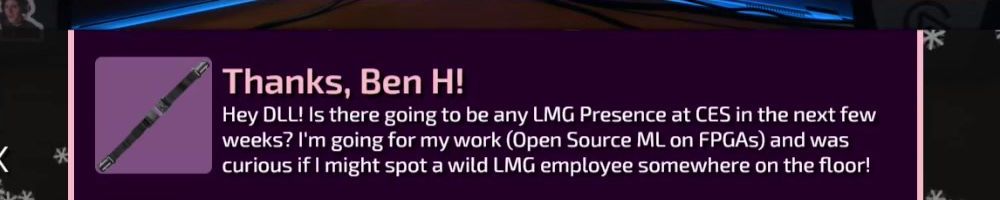Hey DLL! Is there going to be any LMG Presence at CES in the next few weeks? I'm going for my work (Open Source ML on FPGAs) and was curious if I might spot a wild LMG employee somewhere on the floor!