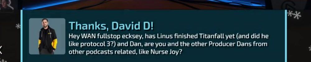 Hey WAN fullstop ecksey, has Linus finished Titanfall yet (and did he like protocol 37) and Dan, are you and the other Producer Dans from other podcasts related, like Nurse Joy?