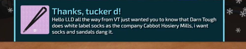 Hello LLD all the way from VT just wanted you to know that Darn Tough does white label socks as the company Cabbot Hosiery Mills, i want socks and sandals dang it.