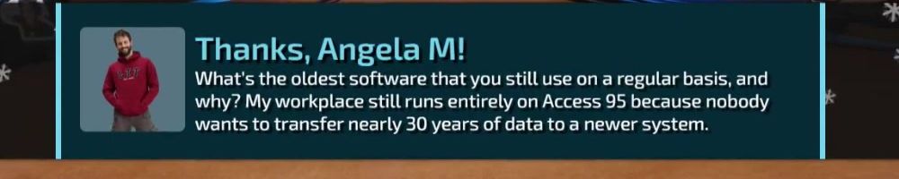 What's the oldest software that you still use on a regular basis, and why? My workplace still runs entirely on Access 95 because nobody wants to transfer nearly 30 years of data to a newer system.