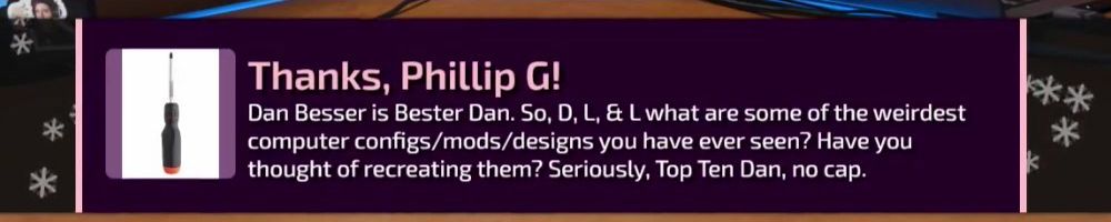 Dan Besser is Bester Dan. So, D, L, & L what are some of the weirdest computer configs/mods/designs you have ever seen? Have you thought of recreating them? Seriously, Top Ten Dan, no cap.