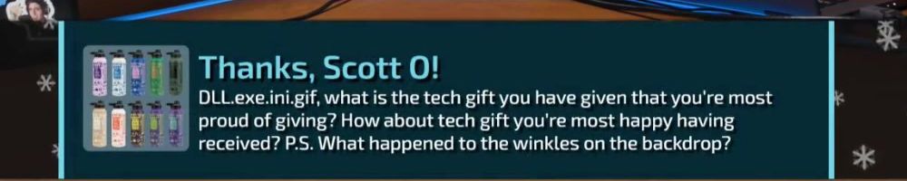 DLL.exe.ini.gif, what is the tech gift you have given that you're most proud of giving? How about tech gift you're most happy having received? P.S. What happened to the winkles on the backdrop?