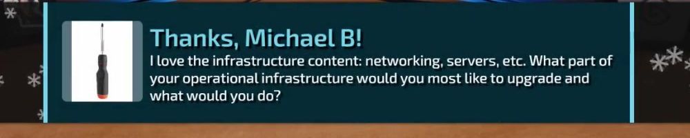 I love the infrastructure content: networking, servers, etc. What part of your operational infrastructure would you most like to upgrade and what would you do?