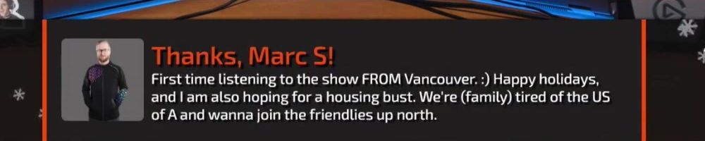 First time listening to the show FROM Vancouver. :) Happy holidays, and I am also hoping for a housing bust. We're (family) tired of the US of A and wanna join the friendlies up north.