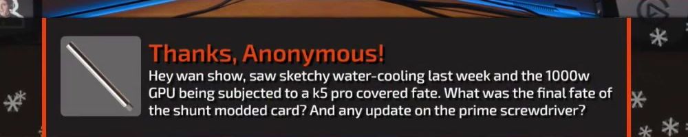 Hey wan show, saw sketchy water-cooling last week and the 1000w GPU being subjected to a k5 pro covered fate. What was the final fate of the shunt modded card? And any update on the prime screwdriver?