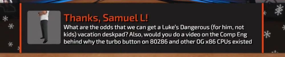 What are the odds that we can get a Luke's Dangerous (for him, not kids) vacation deskpad? Also, would you do a video on the Comp Eng behind why the turbo button on 80286 and other OG x86 CPUs existed