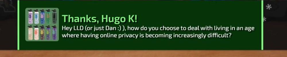 Hey LLD (or just Dan : ) ), how do you choose to deal with living in an age where having online privacy is becoming increasingly difficult?