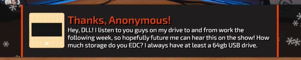 Hey, DLL! I listen to you guys on my drive to and from work the following week, so hopefully future me can hear this on the show! How much storage do you EDC? I always have at least a 64gb USB drive.