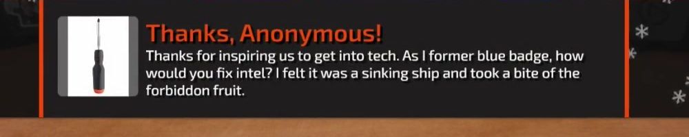 Thanks for inspiring us to get into tech. As I former blue badge, how would you fix intel? I felt it was a sinking ship and took a bite of the forbidden fruit.