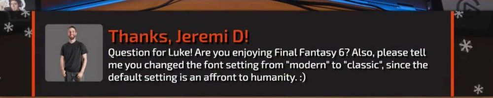 Question for Luke! Are you enjoying Final Fantasy 6? Also, please tell me you changed the font setting from "modern" to "classic", since the default setting is an affront to humanity. :)