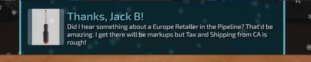 Did I hear something about a Europe Retailer in the Pipeline? That'd be amazing. I get there will be markups but Tax and Shipping from CA is rough!