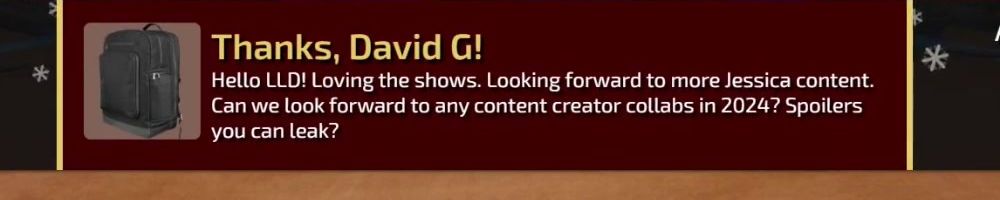 Hello LLD! Loving the shows. Looking forward to more Jessica content. Can we look forward to any content creator collabs in 2024? Spoilers you can leak?