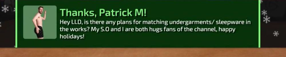 Hey LLD, is there any plans for matching undergarments/sleepware in the works? My S.O and I are both huge fans of the channel, happy holidays!