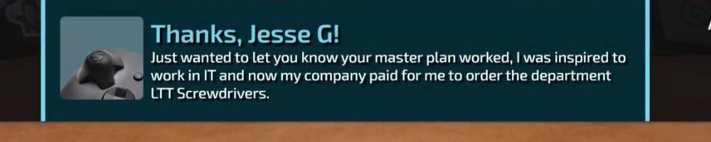 Thanks, Jesse G! Just wanted to let you know your master plan worked, I was inspired to work in IT and now my company paid for me to order the department LTT Screwdrivers.
