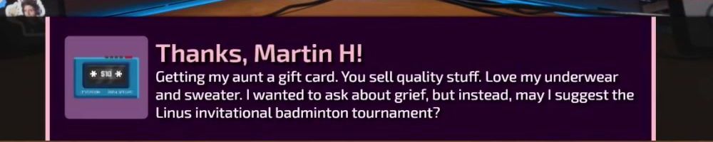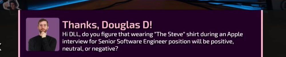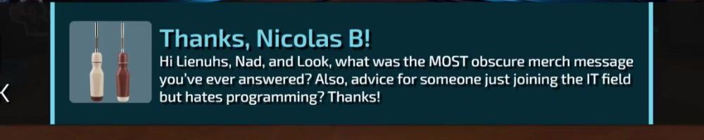 Thanks, Nicolas B! Hi Lienuhs, Nad, and Look, what was the MOST obscure merch message you've ever answered? Also, advice for someone just joining the IT field but hates programming? Thanks!