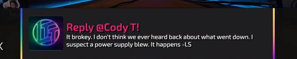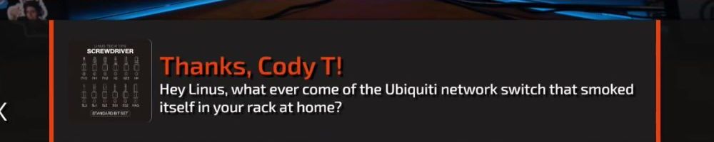 Thanks, Cody T! Hey Linus, what ever come of the Ubiquiti network switch that smoked itself in your rack at home?