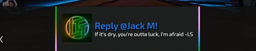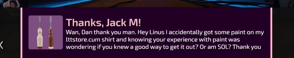 Thanks, Jack M! Wan, Dan thank you man. Hey Linus I accidentally got some paint on my lttstore.com shirt and knowing your experience with paint was wondering if you knew a good way to get it out? Or am SOL? Thank you