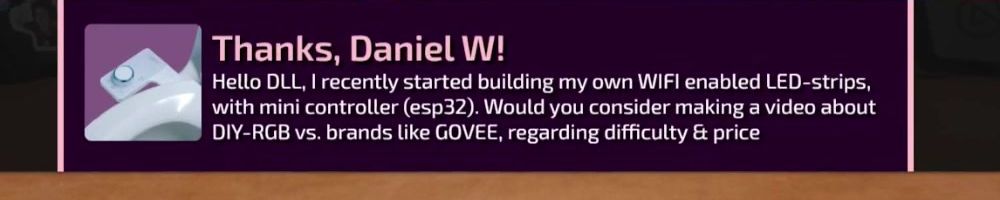Thanks, Daniel W! Hello DLL, I recently started building my own WIFI enabled LED-strips, with mini controller (esp32). Would you consider making a video about DIY-RGB vs. brands like GOVEE, regarding difficulty & price