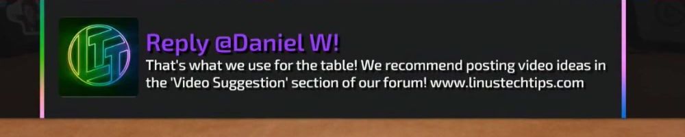 Reply @Daniel W! That's what we use for the table! We recommend posting video ideas in the 'Video Suggestion' section of our forum! www.linustechtips.com