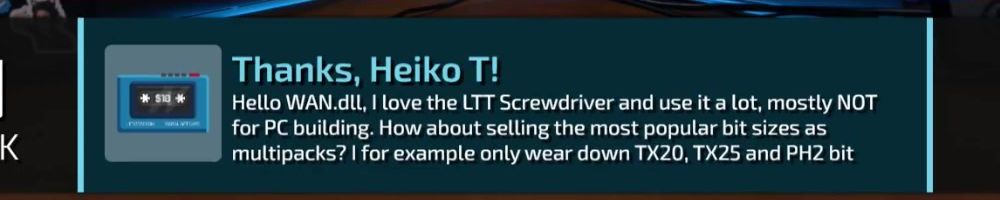 Thanks, Heiko T! Hello WAN.dL, I love the LTT Screwdriver and use it a lot, mostly NOT for PC building. How about selling the most popular bit sizes as multipacks? I for example only wear down TX20, TX25 and PH2 bit