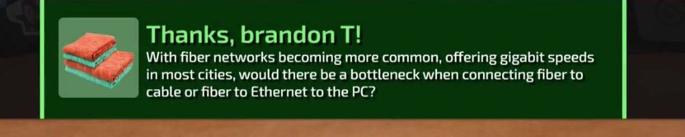 Thanks, brandon T! With fiber networks becoming more common, offering gigabit speeds in most cities, would there be a bottleneck when connecting fiber to cable or fiber to Ethernet to the PC?