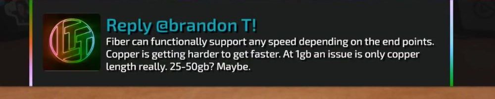 Reply @brandon T! Fiber can functionally support any speed depending on the end points. Copper is getting harder to get faster. At 1gb an issue is only copper length really. 25-50gb? Maybe.