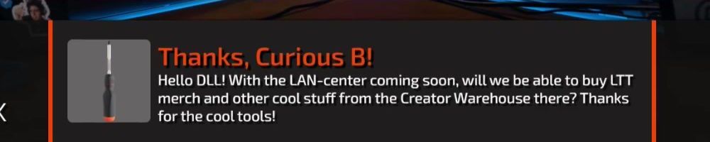 Thanks, Curious B! Hello DLL! With the LAN-center coming soon, will we be able to buy LTT merch and other cool stuff from the Creator Warehouse there? Thanks for the cool tools!