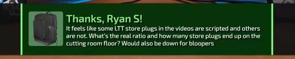 Thanks, Ryan S! It feels like some LTT store plugs in the videos are scripted and others are not. What's the real ratio and how many store plugs end up on the cutting room floor? Would also be down for bloopers
