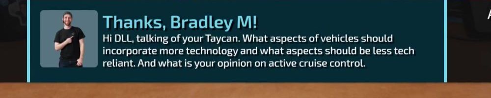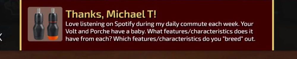 Thanks, Michael T! Love listening on Spotify during my daily commute each week. Your Volt and Porche have a baby. What features/characteristics does it have from each? Which features/characteristics do you "breed" out.