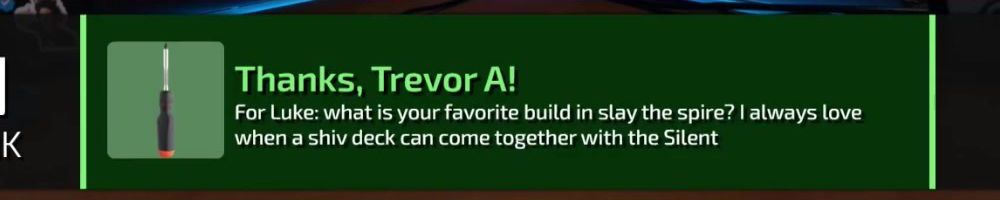Thanks, Trevor A! For Luke: what is your favorite build in slay the spire? I always love when a shiv deck can come together with the Silent