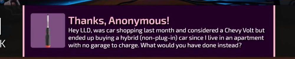 Thanks, Anonymous! Hey LLD, was car shopping last month and considered a Chevy Volt but ended up buying a hybrid (non-plug-in) car since I live in an apartment with no garage to charge. What would you have done instead?