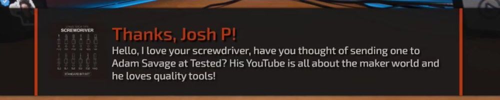 Thanks, Josh P! Hello, I love your screwdriver, have you thought of sending one to Adam Savage at Tested? His YouTube is all about the maker world and he loves quality tools!