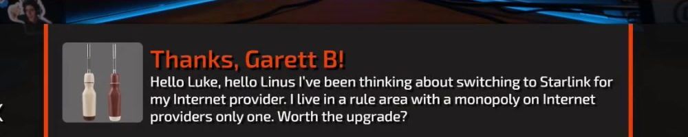 Thanks, Garett B! Hello Luke, hello Linus I've been thinking about switching to Starlink for my Internet provider. I live in a rule area with a monopoly on Internet providers only one. Worth the upgrade?