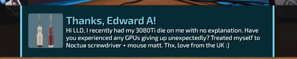 Thanks, Edward A! Hi LLD, I recently had my 3080Ti die on me with no explanation. Have you experienced any GPUs giving up unexpectedly? Treated myself to Noctua screwdriver + mouse matt. Thx, love from the UK :)