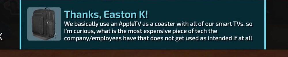 Thanks, Easton K! We basically use an AppleTV as a coaster with all of our smart TVs, so I'm curious, what is the most expensive piece of tech the company/employees have that does not get used as intended if at all