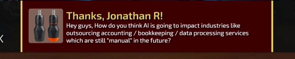 Thanks, Jonathan R! Hey guys, How do you think AI is going to impact industries like outsourcing accounting / bookkeeping / data processing services which are still "manual" in the future?