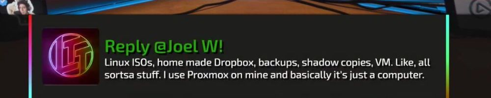 Reply @Joel W! Linux ISOs, home made Dropbox, backups, shadow copies, VM. Like, all sortsa stuff. I use Proxmox on mine and basically it's just a computer.