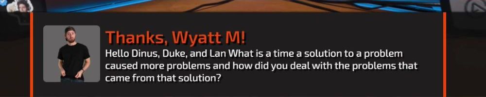 Thanks, Wyatt M! Hello Dinus, Duke, and Lan What is a time a solution to a problem caused more problems and how did you deal with the problems that came from that solution?