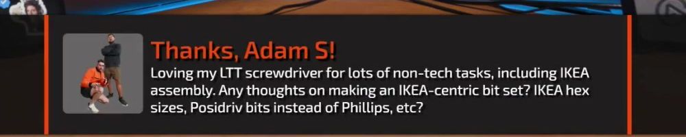 Thanks, Adam S! Loving my LTT screwdriver for lots of non-tech tasks, including IKEA assembly. Any thoughts on making an IKEA-centric bit set? IKEA hex sizes, Posidriv bits instead of Phillips, etc?