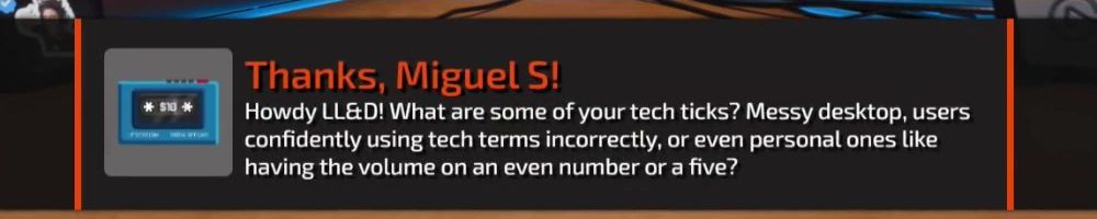 Thanks, Miguel S! Howdy LL&D! What are some of your tech ticks? Messy desktop, users confidently using tech terms incorrectly, or even personal ones like having the volume on an even number or a five?