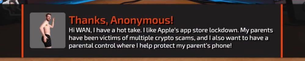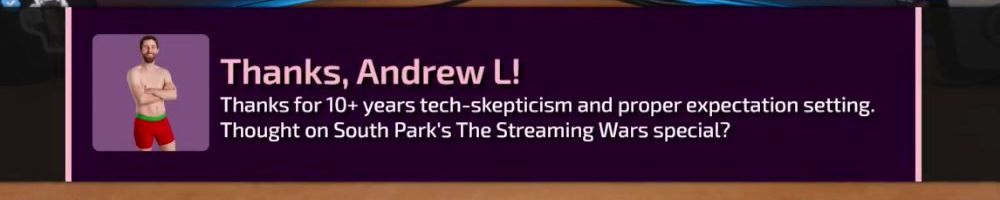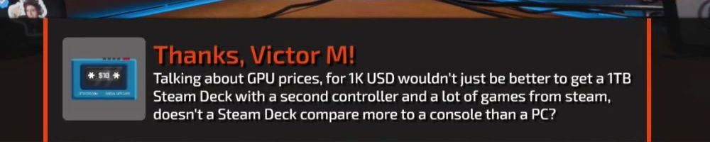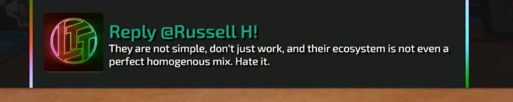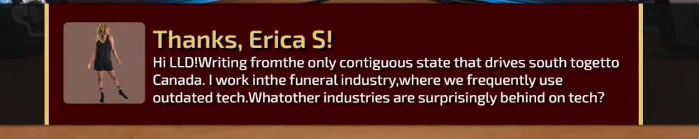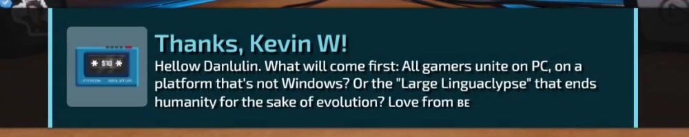 Thanks, Kevin W! Hellow Danlulin. What will come first: All gamers unite on PC, on a platform that's not Windows? Or the "Large Linguaclypse" that ends humanity for the sake of evolution? Love from se
