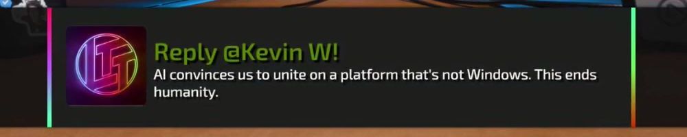 Reply @Kevin W! AI convinces us to unite on a platform that's not Windows. This ends humanity.