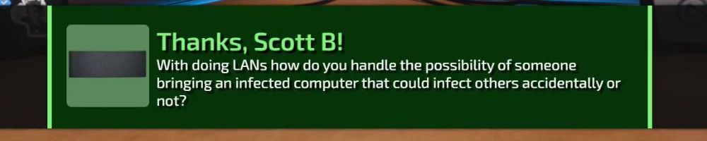 Thanks, Scott B! With doing LANs how do you handle the possibility of someone bringing an infected computer that could infect others accidentally or not?