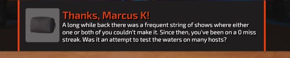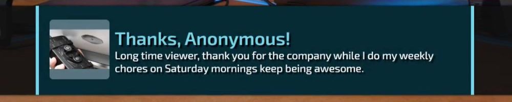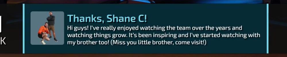 Thanks, Shane C! Hi guys! I've really enjoyed watching the team over the years and watching things grow. It's been inspiring and I've started watching with my brother too! (Miss you little brother, come visit!)