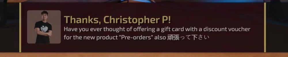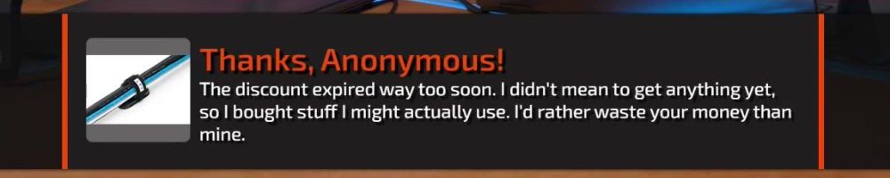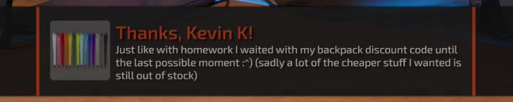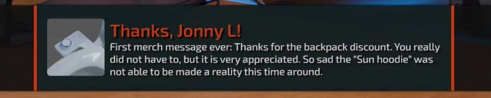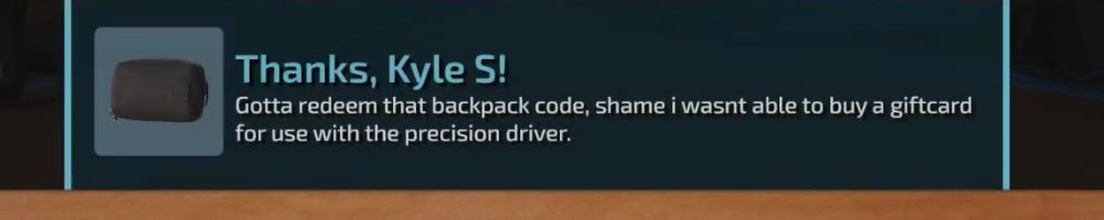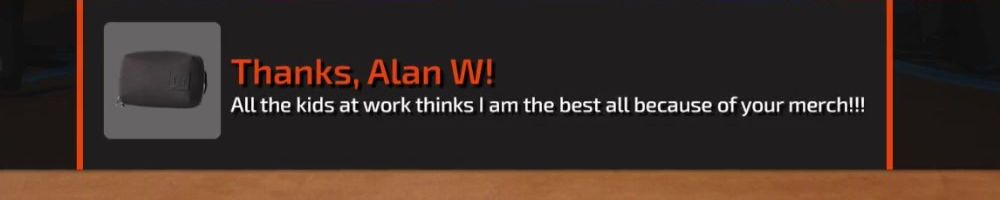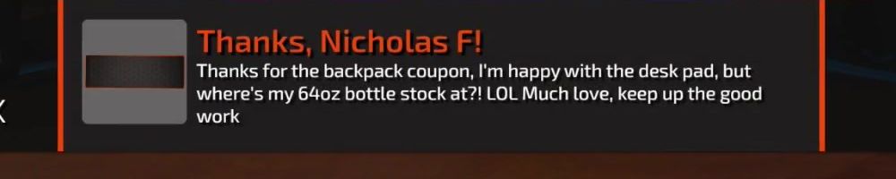 Thanks, Nicholas F! Thanks for the backpack coupon, I'm happy with the desk pad, but where's my 640z bottle stock at?! LOL Much love, keep up the good work