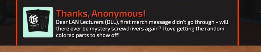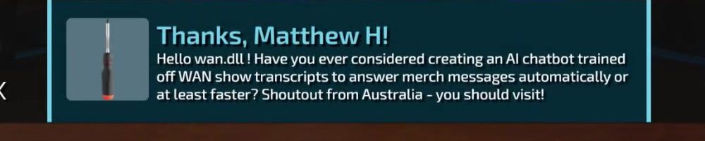 Hint: Use CTRL + F to search messages in this show, or use Whenplane's WAN Show Search tool to search for messages in all shows. Make sure that the "Merch Messages" box is checked when you search for something.