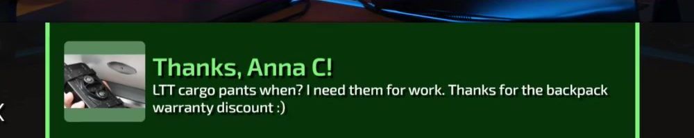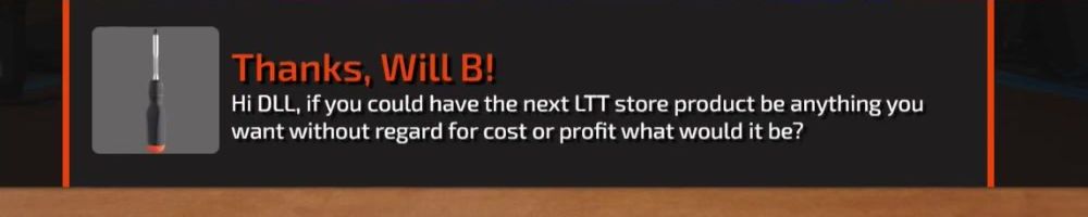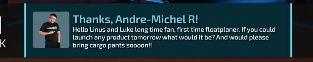 Thanks, Andre-Michel R! Hello Linus and Luke long time fan, first time floatplaner. If you could launch any product tomorrow what would it be? And would please bring cargo pants soooon!!