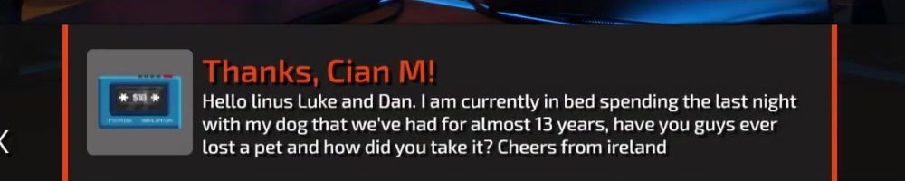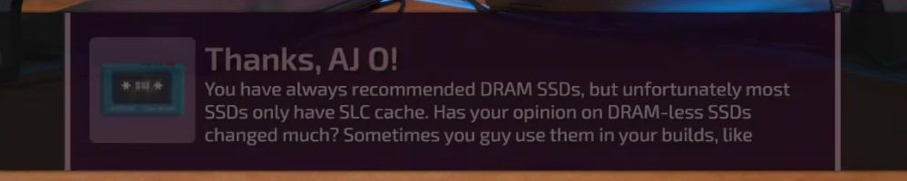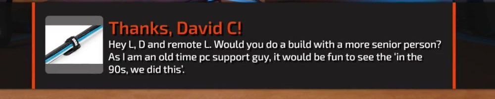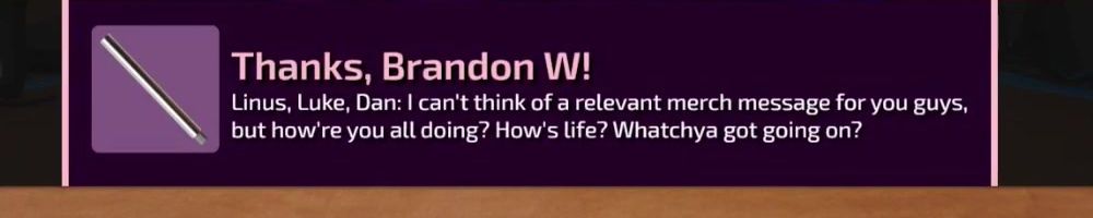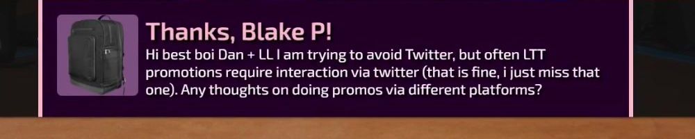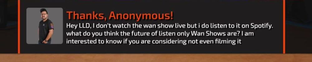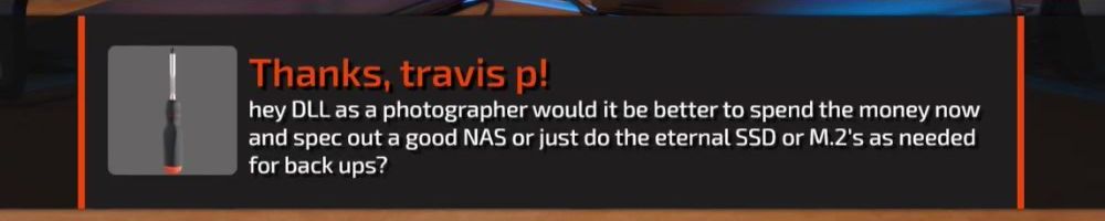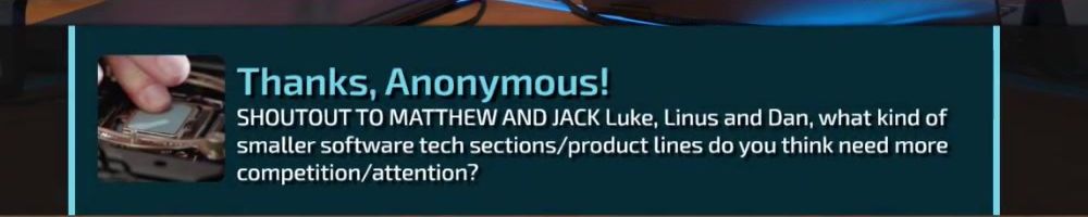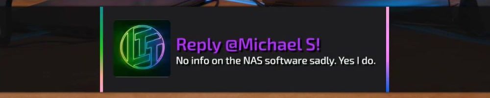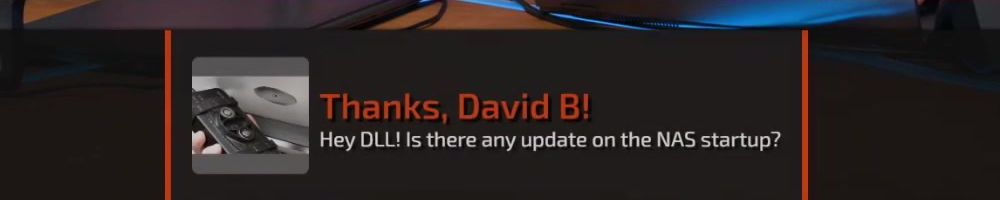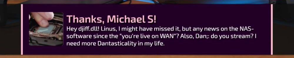 Thanks, Michael S! Hey dijiff.dll! Linus, I might have missed it, but any news on the NAS-software since the "you're live on WAN"? Also, Dan; do you stream? I need more Dantasticality in my life.