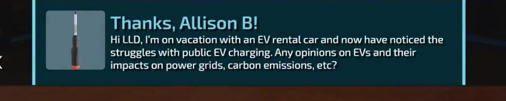 Thanks, Allison B! Hi LLD, I'm on vacation with an EV rental car and now have noticed the struggles with public EV charging. Any opinions on EVs and their impacts on power grids, carbon emissions, etc?